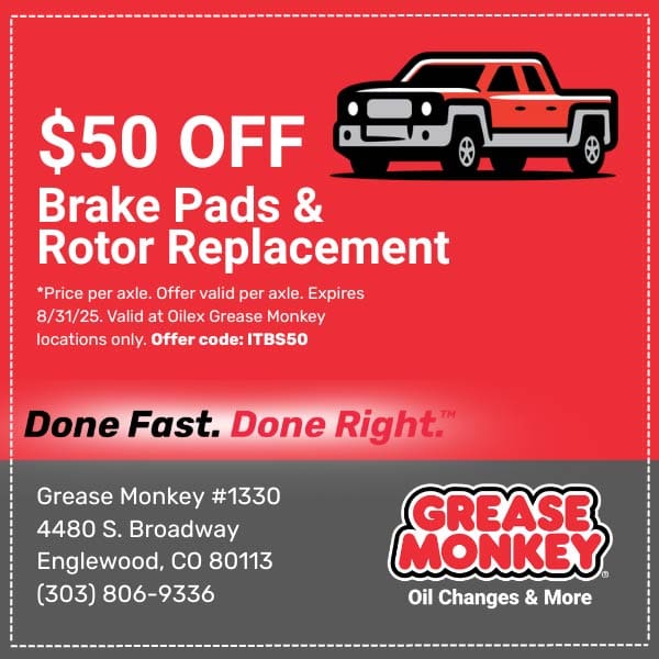 Stop by Grease Monkey® Englewood #1330, located at 4480 S. Broadway, Englewood, CO, 80113 or give us a call at 303-806-9336 to speak with a brake service expert. Want to schedule online? It’s quick and easy—click below to book your free inspection.